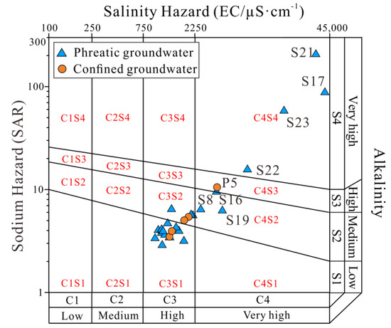 The Wilcox chart constructed by the EC and SAR is an integrated and useful approach to illustrate the water quality for irrigation usage. It divides the potential salinity hazard of irrigation water into four categories, including low salinity hazard (C1), medium salinity hazard (C2), high salinity hazard (C3) and very high salinity hazard (C4). The sodium hazard of irrigation water is also classified into four categories, i.e., low sodium hazard (S1), medium sodium hazard (S2), high sodium hazard (S3) and very high sodium salinity hazard (S4). As shown in Figure 12, most of the collected phreatic and confined groundwater samples are situated in the C3S1 and C3S2 dominances, indicating low to medium sodium and high salinity hazards. Three phreatic groundwater samples (13.04%) are plotted in the C4S2 category, suggesting medium sodium hazard and very high salinity hazard. One confined groundwater, but no phreatic groundwater, is plotted in the C4S3 dominance, indicating both high sodium and very high salinity hazard risks. In addition, four phreatic groundwater samples fall in the C4S4 category, implying the existing risks of very high sodium and very high salinity hazards.