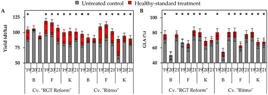 Annual (A) yield (dt/ha) and (B) green leaf area (GLA; RWAUDPC of percentage of leaf area) of the UC (grey bars) and the healthy-standard treatment (red bars) of the wheat cultivars “RGT Reform” and “Ritmo” at the locations Barlt (B), Futterkamp (F), and Kluvensiek (K) from 2019 and 2021. Significant (p ≥ 0.05) differences between untreated control and healthy-standard treatment are marked with *.