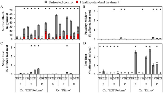 Annual disease severities (RWAUDPC; F-0 70%; F-1 20%; F-2 10%) of (A) Septoria tritici blotch (number of pycnidia), (B) powdery mildew (percentage of leaf area), (C) stripe rust (percentage of leaf area), and (D) leaf rust (percentage of leaf area) of the untreated control (grey bars) and the healthy-standard treatment (red bars) of the wheat cultivars “RGT Reform” and “Ritmo” at the locations Barlt (B), Futterkamp (F), and Kluvensiek (K) from 2019 to 2021. Significant (p ≤ 0.05) differences between the untreated control and healthy-standard treatment are marked with *.
