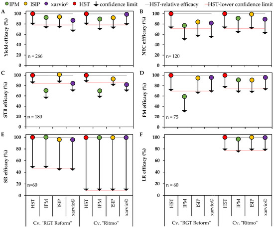 Relative efficacy and lower confidence limit (whisker, α = 0.05) of the healthy-standard treatment (red dots), IPM treatment (green dots), ISIP treatment (yellow dots), and xarvio© treatment (purple dots) in relation to the healthy-standard treatment adjusted by the untreated control for the parameters (A) yield, (B) necrotization (NEC), (C) Septoria tritici blotch (STB), (D) powdery mildew (PM), (E) stripe rust (SR), and (F) leaf rust (LR) from all significant YLC combinations from 2019 to 2021. n denotes the number of significant cases. Dotted lines describe the relative efficacy and the lower confidence limit of the HST.