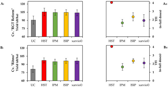 For evaluation of the efficacy of the subjected DSSs, the average yield and TFI of the cultivars “RGT Reform” (Figure 4A) and “Ritmo” (Figure 4B) were used. In the HST, the yield of the more susceptible cultivar “RGT Reform” increased by 8% compared to the cultivar “Ritmo”. As shown in Figure 4AI, the yield in the HST of the cultivar “RGT Reform” (105.50 dt/ha) was 1% higher than the yield of the subjected DSSs (104.29 ± 0.37 dt/ha). Furthermore, the yield of the HST (97.32 dt/ha) in the cultivar “Ritmo” was 1% higher than the yield of the subjected DSSs (95.94 ± 0.85 dt/ha; Figure 4BI).