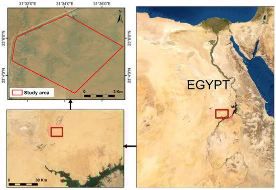 Generally speaking, the total area of Egypt is approximately 1,000,000 km2. The cultivated area does not exceed about 4%, and is confined to the Nile valley and its delta. Accordingly, 96% is desert, comprising the Western and Eastern deserts. The total area of the Western desert of Egypt covers about 680,650 km2, equivalent to two thirds of the land area of Egypt, and is untapped agriculturally. This area is inhabited; however, about 95% of Egyptian people live on the banks of the River Nile and its delta, with a population density of 1500 persons·km2, whereas the Western Desert has a population density of 5 persons·km2. The River Nile is the second longest river in the world and is the main water source in Egypt. Our investigation was implemented in one of the most important agricultural investment attractions, the Toshka project, which is located in the southeastern part of the Western desert. It belongs to the Aswan Governorate and is situated about 250 km south of Aswan city. This area lies between latitude 22°30′ and 23°30′ N and longitude 30°30′ and 32°00′ E, and consists of many interconnected depressions covering about 540,000 acres. It falls into an extremely arid belt, with long hot summers and short warm winters, as well as markedly low precipitation. This project is aimed at maximizing the return of available resources and increasing agricultural exports, thereby helping to reduce the trade balance deficit and providing job opportunities for many young people. El-Sheikh Zayed canal is considered the main irrigation source in this area. This canal branches from the River Nile into four sub-branches, carrying Nile water for reclamation purposes [9]. Based on the aforementioned, the need to reclaim these lands and make them cultivable has become urgent in order to address the huge shortage in agricultural production resulting from the extreme increase in population growth, and to achieve self-sufficiency in strategic crops, especially after the Russian–Ukraine crisis.