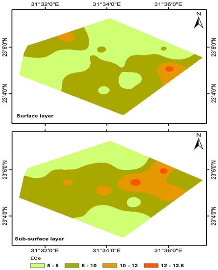 Spatial distribution of ECe values at the surface and subsurface layers (0–30 and 30–60 cm) of the studied area.