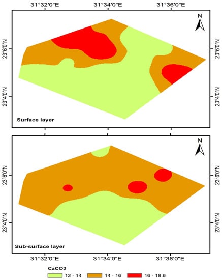 Spatial distribution of CaCO3 content in the surface and subsurface layers (0–30 and 30–60 cm) of the studied area.