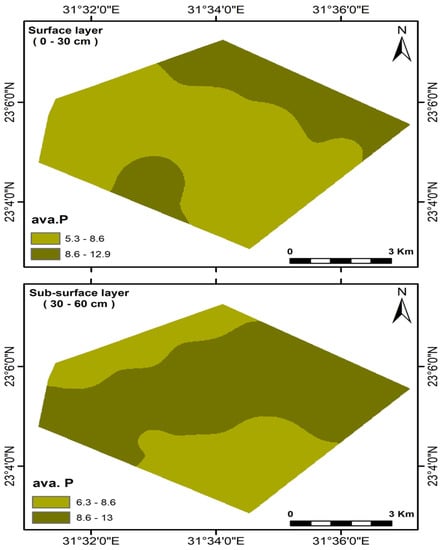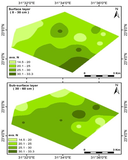 The results pertaining to the evaluation of fertility status in the studied location are given in Table 5 and Figure 4, Figure 5 and Figure 6. Generally, the results were clear evidence of a lack of available nutrients. Values of 33.30, 12.90, and 380.70 mg·kg−1 at the surface layer and 35.30, 13.00, and 349.40 mg·kg−1 at the subsurface layer were recorded as the highest values obtained, with averages of 23.63, 8.25, and 249.73 mg·kg−1 for AvN, AvP, and AvK, respectively. In contrast, values of 14.50, 5.70, and 216.80 mg·kg−1 at the depth of 0–30 cm and 16.50, 6.50, and 211.30 mg·kg−1 at the depth of 30–60 cm were recorded as the lowest values, with averages of 25.53, 9.22, and 275.69 mg·kg−1 for the abovementioned nutrients, respectively.