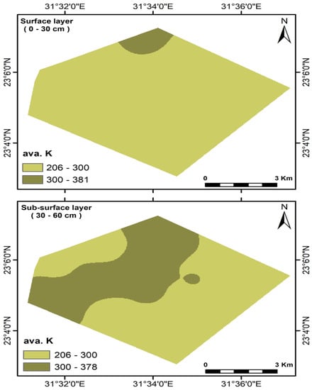 Spatial distribution of available potassium (AvK, mg·kg−1) content in the surface and subsurface layers (0–30 and 30–60 cm) of the studied area.
