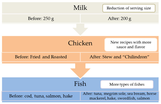According to the established criteria of ≥25% PW patient/day, three critical dishes of BD (milk, chicken and fish at lunch) were selected for phase 2. Despite the highest PW percentage observed in the chicken of CM (63.1%), this dish was not included in the second phase due to a possible overestimated PW. The measured waste corresponded to only 1 day of quantification and the low number of plates analyzed may have affected the determined PW percentages. The modifications implemented in phase 2 were based on suggestions made by the patients and nursing staff, as well as those reported in the literature. A narrative review on hospital food waste summarized the reasons why patients do not finish their meals in four categories [28]: poor appetite due to their illness, service schedules, physical problems such as loss of mobility and the taste and quality of the food. Therefore, the modifications consisted of the reduction of milk serving size, new recipes for chicken and higher variety of fish dishes.