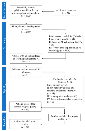 Criterions 2–5 were then applied to assess the relevance and quality of these 111 publications. The full-text version of each article was retrieved and reviewed to determine whether the study contained descriptions of T&L strategies or plans, or detailed information on how to conduct AI courses or projects. In total, 28 studies were excluded following the application of criterion 2. Other papers were excluded because they were not in English (n = 3), not empirical studies (n = 41), or not targeted at students but instead teachers (n = 6). After the exclusion of one paper for poor methodological quality, 32 papers (Appendix A) remained for analysis in this systematic literature review. Figure 1 illustrates the search and selection process.