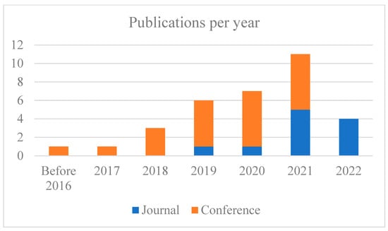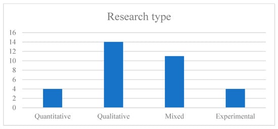 Regarding the scale and the type of selected papers, 11 studies were small-scale research, enrolling less than 20 participants. The remaining studies enrolled no more than 100 participants. Regarding research type (Figure 5), most of the studies (25 of 32) employed a qualitative or mixed-method approach; only four studies were purely quantitative. The quantitative part of these studies principally focused on learners’ motivation and attitudes toward the K-12 AI courses, using Likert-scale surveys for measurements. Only three studies included students’ learning outcomes as part of the quantitative analysis, one adopted students’ self-perceived competence as the assessment criteria for the knowledge acquisition of AI [33]; therefore, only two studies employed an objective quantitative assessment of students’ knowledge acquisition by using scored tests [34,35]. Most of the studies qualitatively assessed students’ learning outcomes through classroom observations, interviews, and artifact analysis.