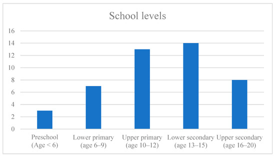 The teaching units identified cover from preschool to secondary school phases, most are situated in the upper primary school and lower secondary school levels (Figure 6). Very few studies have simultaneously considered the primary and secondary school levels. For example, three studies [9,36,37] targeted students in both upper primary and lower secondary schools, whereas only one included students from lower primary to lower secondary school levels. Although AI education is traditionally considered to be suitable for older adolescents, numerous teaching units are available for the primary and even preschool levels. For example, in their two studies, Williams et al. trained young children aged 4–6 years on AI concepts related to knowledge-based systems, supervised ML, and generative AI through interactions with social robots [8,38]. Another study by Vartiainen and colleagues explored how young children (age 3–9 years) can use Google’s Teachable Machine in non-school settings [39]. Exposing children to AI at these earlier educational stages thus appears to be feasible and beneficial.