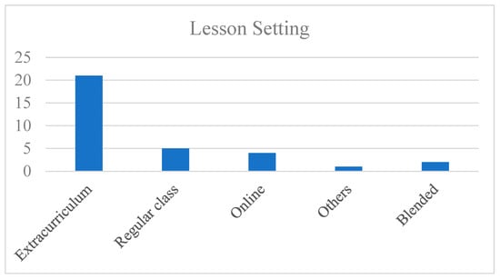 Most of the reported teaching units involve in-person and extracurricular activities (Figure 7) that are conducted in lab settings or in workshops or after-school lessons, suggesting that AI education is still not typically included in regular classrooms, even being absent in technology and computing-related courses. However, three teaching units in five of the included studies are applied in regular classrooms [40,41,42,43,44]. One teaching unit in Finland is implemented as a part of regular curricular activities [40,41,42]; one teaching unit in Spain involves AI education in regular middle school classes [44]; and one teaching unit in Denmark critically emphasizes the social impact of AI and is taught in regular social studies classes [43]. Five studies involved AI education conducted wholly online or in a blended mode in response to the COVID-19 pandemic [34,36,45,46,47]. None of the studies employed asynchronous online teaching.