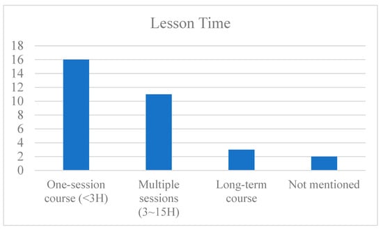 The duration of the teaching units varies considerably. The teaching units can involve short and focused activities (minimum lesson duration: <1 h), multiple extracurricular lessons (3–15 h in total), and long-term courses (maximum lesson duration: ~80 h). However, most are relatively short-term courses (Figure 8). Half of the teaching units (16 of 32) in the reviewed studies comprise only one session lasting no more than 3 h, suggesting that a short lesson may be sufficient for children to develop an understanding of AI concepts e.g., [33,48,49]. The second most popular lesson duration is multiple sessions on different days, typically no more than 15 h or 7 days in total. The teaching units of 11 studies were taught in this mode. Only four studies designed a long-term curriculum spanning several months, with three of these studies being published in 2022.