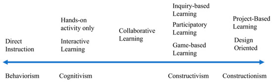 The selected papers included comprehensive descriptions of the learning theories that were referenced, the pedagogical approaches that were employed, and the T&L activities that were implemented. However, different terms are commonly used to describe the same thing. Consequently, after the initial coding of the reviewed studies, we first identified four types of learning theories and nine types of pedagogical approaches. The four learning theories are behaviorism, cognitivism, (social) constructivism, and constructionism, and the nine pedagogical approaches are direct instruction, hands-on activity only, interactive learning, collaborative learning, inquiry-based learning, participatory learning, game-based learning, project-based learning, and design-oriented learning. The relationship between learning theories and pedagogical approaches is illustrated in Figure 9. In Table 4 and Table 5, the learning theories and pedagogical approaches, respectively, are briefly introduced.