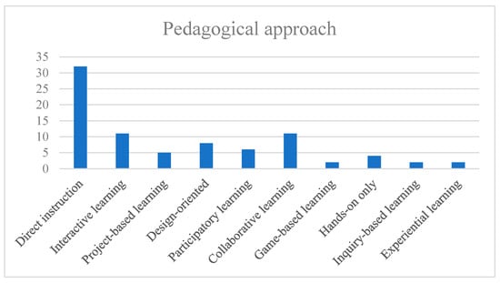 Acknowledging that these learning theories and pedagogical approaches are not mutually exclusive, we present the frequency of different pedagogical approaches employed in the teaching units in Figure 10. Referring to behaviorism learning theory, direct instruction is used in all the teaching units, to different extents, especially in the initial part of the teaching units when foundational AI knowledge is presented. Lectures, videos, tutorials, and demonstrations are the most common T&L activities in the initial stage. Notably, the authors of two studies [49,53] specifically highlighted the importance of including direct instruction in AI education. Fifteen of the reviewed studies employed interactive learning or hands-on only as the main pedagogical approach, representing the second most common approach. The key features of these teaching approaches are that they help students gain hands-on experience and practice with technology, usually focusing on a given procedure or target. In this approach, students do not have much freedom to choose their learning sequence or subgoals.