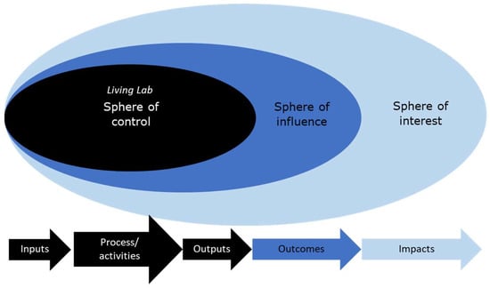 Results-based management (RBM) is a common approach for assessing performance both ex durante and ex post. Its focus on the link between performance and results is a strength. A clear perspective on results from living labs would be of added value to our aims, because we focus on the contribution of the living lab to sustainability transition challenges. Often these results are expressed in quantitative assessments using indicators. However, an RBM approach is often considered less suitable for transition challenges in which goals, objectives and relations between measures, expected outcomes and impacts are either not explicit or unknown. Furthermore, in many instances, factors influencing the transition are outside of the sphere of control of the initiative (see Figure 1). Therefore, for transition initiatives, often a theory of change is described [15,16] which has become a rather common way of articulating the change required and the steps along the way. Furthermore, RBM does little in terms of unpacking performance in terms of (social) processes and relationships [17,18], a key dimension in living labs. We decided that our framework would, therefore, need to be capable of considering the flow from inputs to impact, and to pay attention to collaborative and interactive processes. In other words, we would need to deliver more than a standard performance management framework.