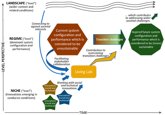 In addition, related to transition experiments, we realized that assessing the extent to which a living lab can contribute effectively to sustainability transitions in a multi-level perspective (MLP) [23] means that we need to take into account the ability of the lab to position itself as an initiative in relation to the niche and regime levels (illustrated in Figure 2). The niche level relates to innovations emerging in conducive conditions, whilst the regime level is the dominant system configuration.