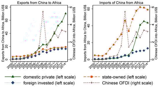 Apart from natural resources (discussed below), a large number of Chinese MNEs have decided to conduct their economic activities in Africa with the aim of gaining access to this promising market. The Go Global policy further urged Chinese firms to take advantage of booming world trade to invest in global markets. An increasing number of Chinese enterprises, including state-owned enterprises (SOEs) and private enterprises, have ventured into investing and operating abroad. The Go Global policy has set several goals: moving from an investment to an innovation-driven economy, increasing Chinese outward foreign direct investment, and promoting the competitiveness of Chinese companies in global markets [17]. The Go Global strategy puts emphasis on China’s OFDI, which is supposed to enable China to better integrate into the global economy and improve access to domestically scarce raw materials [18]. Eventually, China’s OFDI surpassed its inbound FDI for the first time in 2014, reaching a historical record of $123.12 billion. Under the impact of the Go Global policy, the same tendency has also been found for China’s overseas trade, particularly for China’s exports, which undoubtedly improve the competitiveness of Chinese companies and products. Thus, it is essential to investigate how China’s OFDI exerts an impact on its trade with the African continent.