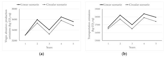 In year 1, the same quantity of abrasives is bought in both scenarios, as there is no collected material to be recycled. In years 2 to 5, the amount purchased is lower in the circular scenario than in the linear scenario as part of the demand is filled with recycled material. Because crushed stones are not produced through recycling, the quantity of crushed stones purchased is the same in both scenarios (about 676 tons/year). Over the 5 years, 1.81% less sand is purchased in the circular scenario. Considering both types of abrasives, we observe that on average, 7005.36 tons/year are purchased in the linear scenario. This quantity drops to 6890.66 tons/year in the circular scenario, a reduction of 1.64%. Although this difference seems low, it is significant in terms of cost savings and CO2 emissions reduction.
