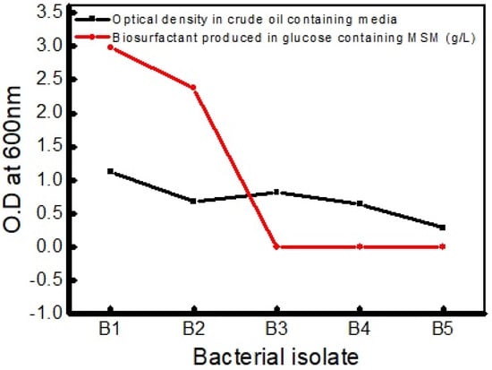 Initially, the value of the COD of crude oil was observed to be 4200 mg/L (Figure 6). The highest results in COD deduction came from bioremediation studies that utilized individual bacterial strains. About 75% COD reduction was observed with strain B1, while strain B2 resulted in a 71% reduction. In 24 h of incubation, the reduction in COD value was achieved with the interaction of biosurfactants that facilitated the initiation of oil-in-water and water-in-oil emulsions above 50%.
