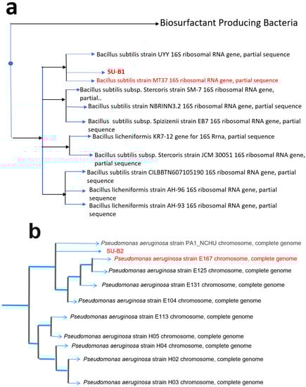 Phylogenetic trees of (a) B. subtilis B1 and (b) P. aeruginosa B2 were isolated from soil samples.