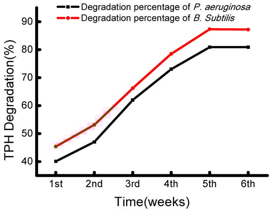 Percentage of crude oil degradation by the strain B1 (B. subtilis) and B2 (P. aeruginosa) at weekly intervals and incubation for 6 weeks.