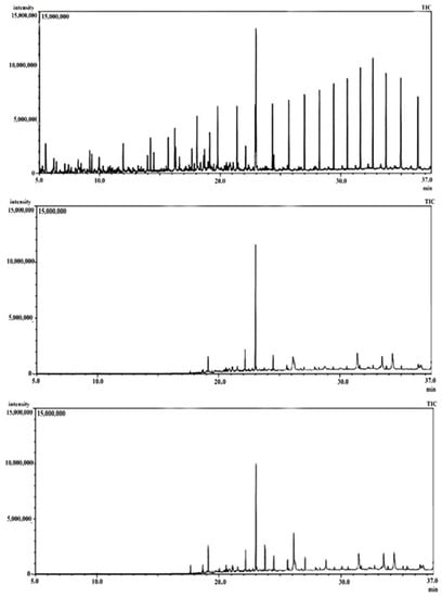 GCMS chromatographs: abiotic control (top), crude oil treated for 4 weeks by B. subtilis B1 (middle), and crude oil treated for 4 weeks by P. aeruginosa B2 (below).