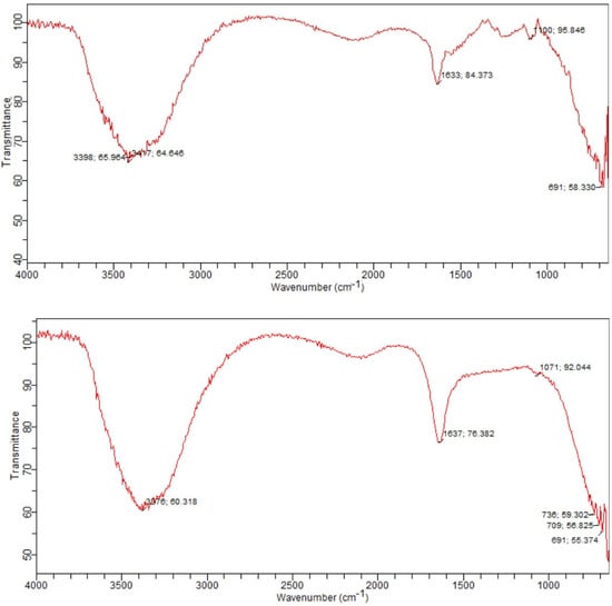 The biosurfactant-purified column of the FTIR spectrum showed the important bands at 3376, 1637, 1071, and 691 cm−1 for strain B1, which indicates that the components are similar to surfactin biosurfactant [58]. On the other hand, for strain B2, the important bands are at 3398, 3417, 1633, 1100, and 691 cm−1, indicating that the components are like rhamnolipids (Figure 5) [59]. In the case of strain B1, the formation of a broad band at 3376 cm−1 confirms the presence of a hydroxyl group. The band peak at 1637 cm−1 shows the presence of the COO− group. Absorption at 1071 cm−1 indicates the presence of a glycosidic bond, whereas absorption at 690 cm−1 shows the presence of the C-H group. In the case of strain B2, the formation of broad band at 3398 and 3417 cm−1 indicates the presence of a hydroxyl group. The band at 1633 cm−1 asserted the presence of the carboxyl group (COOˉ), whereas the absorption at 1100 cm−1 showed the presence of a glycosidic bond (C-O-C). The absorption at 690 cm−1 shows the presence of the C-H group. Therefore, from the discussion above, the biosurfactant produced by strain B1 was confirmed as surfactin, while the biosurfactant produced by strain B2 was confirmed as rhamnolipid. For the interpretation of the results, the spectrum was compared with Pornsunthorntawee et al. [60].