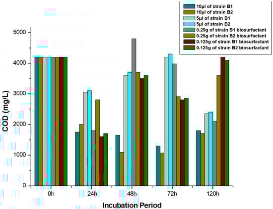 This test was performed with both strains (B1 and B2). Both organisms were cultured in nutrient broth media and utilized for the assay. The experiments were carried out in 100 mL Erlenmeyer flasks, and the samples were taken after incubating them for 0, 24, 48, 72, and 120 h at 30 °C and 150 rpm. A total of eight tests were carried out in which 10 µL of each strain was initially added to 50 mL of the crude oil. Secondly, 5 µL of each strain was added simultaneously to 50 mL of the crude oil. Next, 0.25 g of each biosurfactant produced by strains B1 and B2 was separately added to each 50 mL of the crude oil. Finally, 0.125 g of each biosurfactant produced by the strains was added simultaneously to 50 mL of the crude oil. The COD determination was performed in a COD reactor using potassium dichromate as an oxidant agent [54].