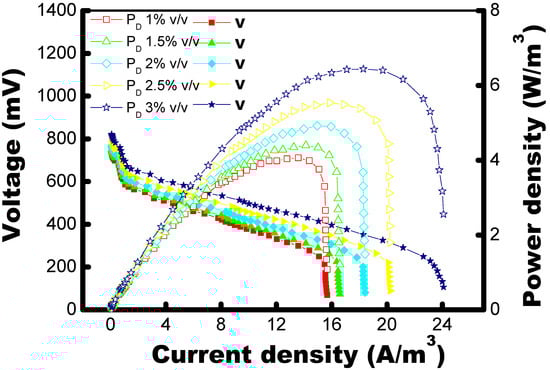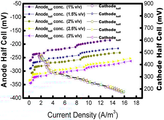The polarization study was carried out with a co-culture of B1 and B2 using a 1:1 ratio in the MFC to determine how much power was produced during the biodegradation of hydrocarbons. Figure 7 shows the relationship between the anode potential (Ea) and the current density measured in MFCs tested with varying concentrations of hydrocarbon in their anode chambers. A drop in anode half-cell potential relative to current density is shown in the Figure 7, with a corresponding increase in the OCV. The drop in anode potentials is caused by a reduction in the accumulation of electrons produced by the exoelectrogenic microbe because of a lower concentration of hydrocarbons as a carbon source. The half-cell potentials at the anode against 10k Ohms external resistance were −280 mV, −297 mV, −310 mV, −370 mV, and −340 mV for 1%, 1.5%, 2%, 2.5%, and 3% v/v, respectively.