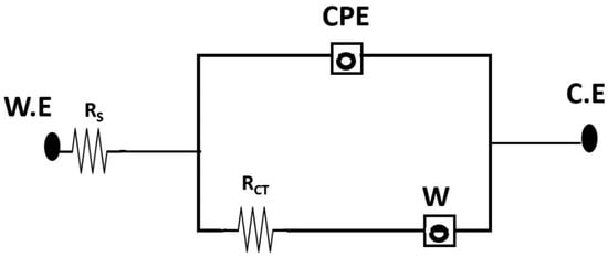 Each MFC was operated for almost 8 weeks, proving its ability to supply a constant current over extended periods. After the fifth cycle, a polarization study was conducted utilizing a co-culture of B. subtilis B1 and P. aeruginosa B2 to evaluate the variation in power output among the five MFCs. Power densities observed from MFCs vary with crude oil concentrations in the anode chamber. As seen in Figure 7, the altered electrodes exhibited a notable increase in energy output. The maximum power generated was 6.3 W/m3 in the case of 2.5% in 100 mL oil concentration, compared to the other crude oil concentrations tested. The power density was measured to be 4.0, 4.4, 4.8, and 5.2 W/m3 at oil concentrations of 1% v/v, 1.5% v/v, 2% v/v, and 3% v/v, respectively. The power density determined after inoculation of co-culture of hydrocarbon-degrading bacteria (B. subtilis and P. aeruginosa) was 6.3 W/m3, and open circuit voltage was recorded as −370 mV. Figure 8 shows an equivalent circuit of MFCs.