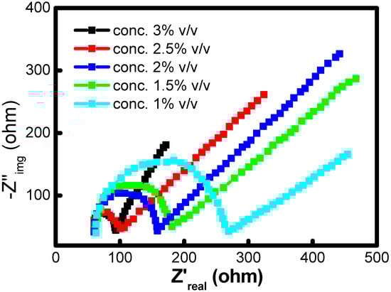 Electrochemical impedance spectroscopy (EIS) is a well-known way to determine how an anode electrode’s surface behaves at the interface. Figure 9 shows the Nyquist plots for the anode on the 8 weeks of operations with different co-culture inocula. The Nyquist plot has a semicircle and a linear portion, which represents charge-transfer resistance and diffusion resistance, respectively. This implies that the electrochemical reaction on the biofilm is mix-controlled by the charge transfer and diffusion step. The experimental spectra were fit into equivalent circuits to evaluate the impedance data. A potentiostat was used to record the EIS data. The working electrode was the anode, and the counter electrode was the cathode. During the electrochemical measurements, the saturated Ag/AgCl (1 M KCl) electrode was used as a reference electrode. This electrode was placed close to the anode electrode. From the fitting data of the above-mentioned equivalent circuit, it was possible to determine a few of the most important resistances, such as charge transfer resistance (Rct) and solution resistance (Rs). When testing the anode chamber with varying concentrations of crude oil (1.0% v/v, 1.5% v/v, 2% v/v, 2.5% v/v, and 3% v/v), the 2.5% concentration showed an internal resistance of 85 Ω. The internal resistance measured at different concentrations of crude oil wwere 273.5 Ω, 117.5 Ω, 103.5 Ω, and 90 Ω at 1, 1.5, 2 v/v, and 3% v/v, respectively.