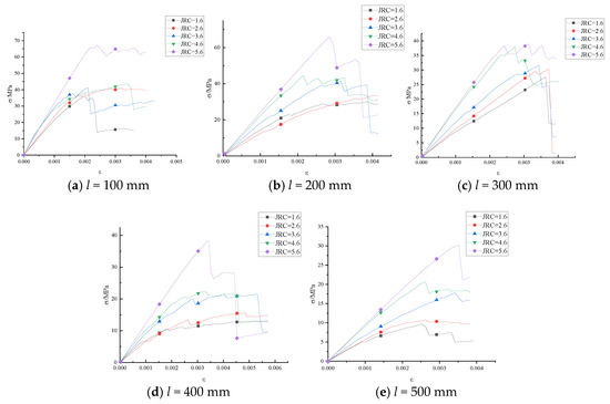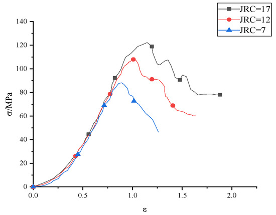 The stress–strain curves corresponding to different joint roughness coefficients.