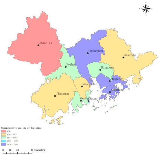 Comprehensive logistics quality of the cities in the Guangdong-Hong Kong-Macao Greater Bay Area.