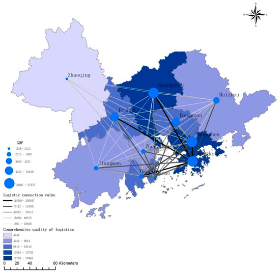 Figure 3 illustrates the structure of the logistic network of the Guangdong-Hong Kong-Macao Greater Bay Area. In Figure 3, lines with the lightest grey color show the weak links, with values under 18,856 in ArcGIS. The darker the link between two cities, the stronger their logistics link. The larger the node, the more developed the city is in the overall network. Figure 2 shows significant hierarchical characteristics in the spatial linkages of the entire Guangdong-Hong Kong-Macao Greater Bay Area. According to Figure 2, regions with high spatial linkages are concentrated in the four central cities of Hong Kong, Shenzhen, Guangzhou, and Macao. In addition, Figure 3 indicates a positive relationship between the economic development of cities and the level of logistics links, i.e., cities with strong logistics links have a high level of economic development. Logistics links imply the cross-regional flow of capital and resources in the context of economic globalization and regional economic integration. The closer the links, the smoother the channels of capital and resource circulation between regions, and the higher the level of economic and social development.