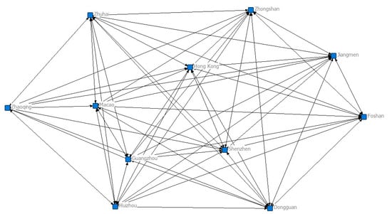 Social network analysis is an important research method in the new economic geography, which considers the importance of the relationships among interacting members. This method describes patterns of relationships using graphical tools and algebraic modeling techniques, and explores the impact of these patterns on the members of a structure or the whole. This method analyzes the structure from a ‘relational’ perspective. In this analysis, structures are behavioral, political, social, or economic [23,24]. Recent studies have widely used social network analysis to analyze the network characteristics, density, and structure of urban agglomerations [9,25]. Based on this, this study analyzes the density, centrality, and cohesive subgroups of the economic linkages and logistic network in the Guangdong-Hong Kong-Macao Greater Bay Area using UCINET 6. In this way, this method provides a comprehensive understanding of the process of high-quality economic development in the Guangdong-Hong Kong-Macao Greater Bay Area.
