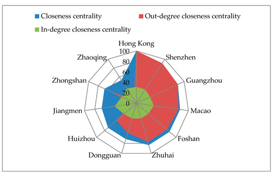 Closeness centrality characterizes the average length of the shortest path from a city node to all other city nodes, to reflect the accessibility of city nodes in the economically linked logistic network [32]. Based on Figure 5, six cities have the top closeness centrality in the Guangdong-Hong Kong-Macao Greater Bay Area: Hong Kong, Shenzhen, Guangzhou, Macao, Foshan, and Zhuhai. Hence, these cities do not rely entirely on intermediate nodes for logistics and they are able to achieve higher efficiency in logistics communication. Hong Kong has the highest out-degree closeness centrality, reflecting its central position in the logistics of the Guangdong-Hong Kong-Macao Greater Bay Area. The logistics development of the Guangdong-Hong Kong-Macao Greater Bay Area belongs to the central city-driven model, with the ports of Hong Kong, Shenzhen, and Guangzhou in the Bay Area port cluster ranking among the top 10 container ports in the world. With the staggering development of these three ports from the economic, financial, and trade perspectives, their advantages complement each other and gradually spread and radiate to the surrounding cities [33]. Except for Jiangmen and Zhaoqing, the out-degree closeness centrality is greater than the in-degree one in the other nine cities. For the most part, their out-degree closeness centrality is twice the in-degree closeness centrality. This implication indicates that the role of Hong Kong and the other nine cities in the Bay Area to the surrounding cities is greater than their degree of influence by the logistics radiation of other cities. In other words, the logistics radiation function is greater than the logistics agglomeration function in the nine cities. Among the nine cities, Hong Kong, Shenzhen, Guangzhou, and Macao have the most significant effects on the neighboring cities. This implication also reaffirms the prominent position of Hong Kong, Shenzhen, Guangzhou, and Macau as the central cities in the logistic network.