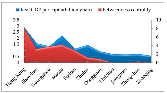 Betweenness centrality indicates the probability that the shortest paths need to pass through a city to connect other city nodes, reflecting the transit role of city nodes in the logistic network [32]. The betweenness centrality of Hong Kong is at the top of the logistic network in the Guangdong-Hong Kong-Macao Greater Bay Area. This rank implies that the shortest paths through Hong Kong are the most central in the logistic network in the Guangdong-Hong Kong-Macao Greater Bay Area, with strong control over resources. Hence, these paths have the ability to influence the logistics communication of most city nodes in the region. After Hong Kong, the clustering analysis shows that the second group includes Shenzhen, Guangzhou, and Macao in terms of betweenness centrality, whose values are greater than three. These three cities form the secondary core of the Guangdong-Hong Kong-Macao Greater Bay Area, which plays a crucial role as a bridge in logistics communication. In the third group, betweenness centrality ranges from zero to three in Foshan, Dongguan, Zhuhai, and Zhongshan, which are general city nodes in the Guangdong-Hong Kong-Macao Greater Bay Area. Finally, betweenness centrality is extremely weak, equal to 0, in Huizhou, Jiangmen, and Zhaoqing. Most of the cities’ logistics links are established through intermediary cities such as Hong Kong, Shenzhen, Guangzhou, and Macao. Each city acts as a “broker” for logistics links 2.273 times on average. Figure 5 represents the correlation analysis of the statistics. According to Figure 6, the Pearson correlation coefficient is 0.943 between real GDP per capita and betweenness centrality in the Guangdong-Hong Kong-Macao Greater Bay Area. This value indicates that the logistics importance of each city node is highly correlated with the development level of real GDP per capita in each city and does not jump out of the distribution pattern of GDP development. The high growth of GDP is the basis for the logistics industry to reduce costs and increase efficiency. The logistics industry is an inherent requirement for achieving high-quality economic development in the Guangdong-Hong Kong-Macao Greater Bay Area. Additionally, the logistics industry is an important lever for improving the industrial development and investment environment, which plays a critical role in cultivating new momentum for economic development in the Guangdong-Hong Kong-Macao Greater Bay Area. In addition, the logistics industry has a strategic importance to the leading and radiation-driven role of the greater bay area.