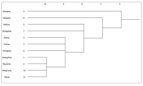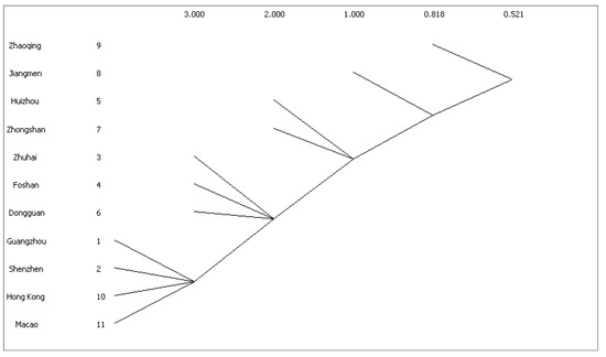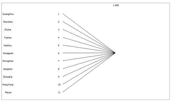 The concept of cliques is too complex, and the concept of n-cliques is easier for people to understand. An n-clique means that one of the subgraphs in a graph satisfies the condition that the distance between any two points in that subgraph (i.e., the length of the shortcut) does not exceed “n” at most. This study sets the maximum partition depth equal to one and the minimum value of n equal to the default value of three, using the n-cliques analysis function of UCINET 6, combined with the research problem, after several trial runs. As shown in Figure 8, there is a very clear trend of integration in the Greater Bay Area. Many core cities in the Pearl River Delta region have integrated with Hong Kong and Macao, forming several metropolitan areas. These include the Hong Kong-Shenzhen-Dongguan-Huizhou metropolis circle, which is driven by technological innovation; the Australia-Zhuhai-Zhongjiang metropolis circle, emphasizing the development of a circular economy; and the Guangzhou-Foshan-Zhaojiang metropolis circle with modern manufacturing and industrial and commercial services as its leading industries [35]. Under the “One Belt, One Road” initiative, regional industrial synergy is a prerequisite for dynamic economic development, and the economic growth of the Guangdong-Hong Kong-Macao Greater Bay Area is an enabler for the diversity, connectivity, and sustainability of the logistic network.