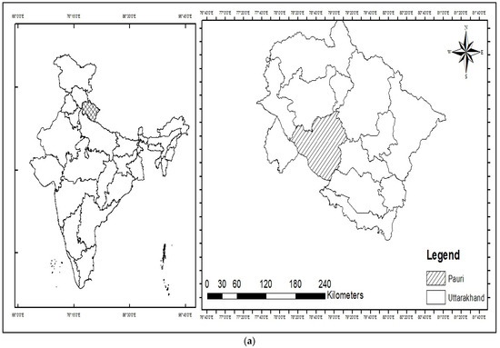 The research was carried out in the Pauri district of Uttarakhand, India. The district (29°20′–30°15′ N; 78°10′–79°20′ E) has an average elevation of 1800 m above sea level (m asl) (range 210–7817 m asl) and occupies a land area of 5230 km2 (FSI, 2019 [119]). The district’s population is 686,527, with a density of 129 persons per km2, and the sex ratio is 1103 females per 1000 males. The district has reported a negative population growth rate (−1.51%). The district has an 82.59 percent literacy rate (males 93.18 percent, females 73.26 percent), compared to 74.04 percent in India (males 82.14 percent, females 65.46 percent) (Census of India, 2011 [120]). With a mean annual temperature of 25–30 °C (45 °C in June and 1.3 °C in January) and a mean annual rainfall of 2180 mm, the area has a sub-temperate to temperate climate, with over 90% of precipitation falling during the monsoon season (July–September).