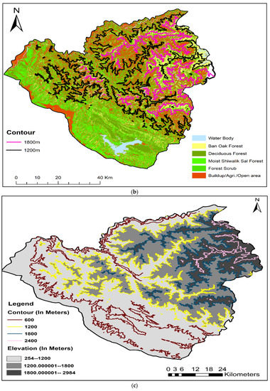 The district has a hilly topography. The fluvial valleys have a convex shape, with steep valleys, interlocking spurs descending the main river, and terraced agricultural fields on the valley sides’ moderate slopes. The people, who stay in the area, are primarily involved in agriculture, rely on forest resources for their survival, and are locally known as Garhwali. Tourism and animal husbandry are supplementary income sources in the region. The Garhwal region is predominantly rural, with scattered housing patterns and a mixed economy. The landholding is scattered and small, and per capita land availability is 0.68 ha in the hilly districts and 1.77 ha in the plain districts. Out of the total reported land, only 14.02% is under cultivation, and more than 55% is rainfed. The existence of different topographical and orographic elements has resulted in exceptional biodiversity in the region. The state is well-forested and consists of about 34,652 square kilometers (64.78%) of forest cover; the study district has 3269 square kilometers (61.34 %) of forested area. Out of the total, 519 km square (15.87%) is very dense forest; 1954 km square (59.77%) is moderately dense forest; and 672 km square (24.35%) is open forest. The district contributes 13.48% of forest area to the state, and its share in national forest cover is 03.45%. The per capita forest area in the district is 0.0047 km square per person, much higher than the state’s per capita forest area, i.e., 0.0024 km2 per person (ISFR, 2021) [121]. The forest type (Figure 1b) in the district shows a considerable higher difference. The forest of the study district is differentiated into moist Shivalik sal forest, deciduous forest, and ban-oak forest.