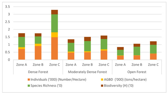 The availability of resources, i.e., fodder and fuelwood, was found to be highest in Zone A, followed by Zone B and C, with more dependents in Zone B and C than in Zone A. A higher number of dependents indicates greater competition and a lower proportion of households acquiring sufficient fodder and fuelwood. Indeed, Jha et al. (2020) [131] have reported similar findings about resource accessibility, availability, and sufficiency. The strategy index, which comprised six indications, was determined to be greatest in Zone C, followed by Zone B and Zone A. Zone C had the most individual trees (number/hectare), followed by Zone B and Zone A; Zone C also had the highest density of trees. The dense forest in Zone A had a stem density of 716 trees/ha, which is within the range described by Sharma et al. (2011) [156] for Indian forests and Saxena and Singh (1982) [157] for a forest in the Kumaun Himalaya. However, this result was lower than the range reported by Gairola et al. (2011) [158] for a forest in the Western Himalayas. The aggregate tree density in Zone B varied from 286 to 907 trees/ha, and the tree density of Quercus leucotrichophora (273 trees/ha) in Zone B (1200–1800 m asl) was lower than reported by Gairola et al. (2011) [158] and Pandey (2001) [159]. The dominating species in Zone C was found to be Quercus leucotrichophora, a dominance at high altitudes that have also been documented by Sharma et al. (2009) [127] (Garhwal Himalaya). Detailed analysis on individuals (trees/ hectare), above-ground biomass density (AGBD), species richness, and biodiversity in dense, moderately dense, and open forests in the selected zones (A, B, C) of the study district is presented in Figure 4.