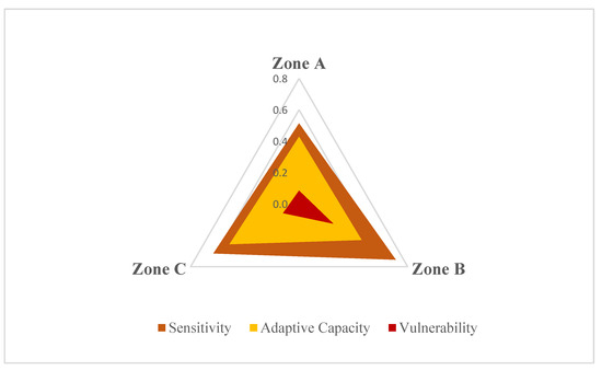 The vulnerability in Zone C is lower than in Zone B and higher than in Zone A (Figure 5). The vulnerability of Zone C is attributed to the availability, collection, and degradation of natural resources, while the zone has a comparatively better adaptive capacity to withstand climate change. Although this zone reports sufficient availability of natural resources, they are not easily accessible, and those that are accessible are currently degrading due to higher anthropogenic pressures. The lowest vulnerability was reported in Zone A, owing to lower dependency on natural resources and availability of alternatives representing a better adaptive capacity.