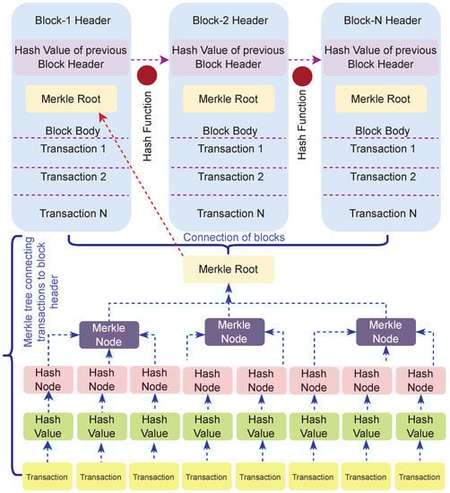 The blocks in the blockchain are generally arranged in a particular order, which contains the original data. Each block points to the preceding block using a hash value. The first block, called the genesis block, does not point to any block and, thus, is the parent/root block to the other subsequent child blocks. Each child holds a unique hash key, which is linked to the preceding block, also known as the parent block [,]. The simplified architecture of blockchain and its components is illustrated in Figure 2.