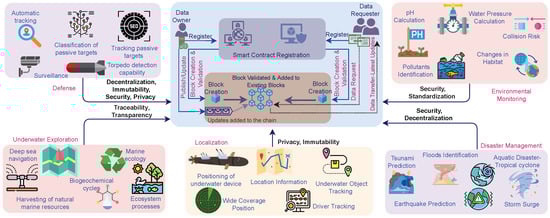- Improving security in underwater communication—The sensors capture the significant information and relay and send the data to the monitoring center present on the land surface. The information transmitted is highly sensitive, which brings several problems such as data stealing, network hacking, and breaking the communication systems []. There is also a dire need to provide secured and trusted solutions for the processing and storage of the enormous amount of data being generated from the IoUT devices. The blockchain-based network architectures provide solutions to the aforementioned challenges by providing immutability and trustworthy data sharing and management and also enable efficient monitoring and tracking of the underwater devices, processes, and related resources. Blockchain [] ensures secured and trusted data sharing in the underwater communications without interventions from humans or third parties. Furthermore, the need for autonomous decision-making in the hostile underwater environment with fickle network connectivity with base stations is supported by blockchain. The smart contract features of blockchain enable such dynamic and autonomous decision-making, ensuring secured data storage and the reliability of such frameworks.