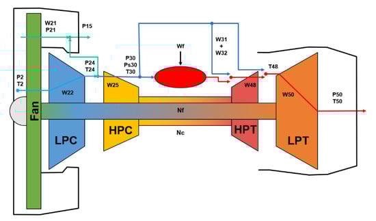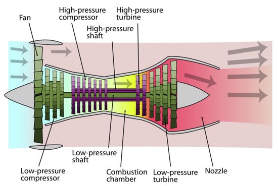NASA’s C-MAPSS project is a high-fidelity computer model that models the damage propagation of aircraft gas turbine engines [18]. Figure 1 shows the diagram of the simulated run-to-failure trajectories of a small fleet of turbofan engines with the main elements. The simulated engine is a tow spool turbofan engine with a high level of thrust of up to 400,340 N, which operates under operating conditions ranging from sea level to 12,192 (m) of altitude and ambient temperature varying from −51 to 39 °C [22]. The air is introduced into the low-pressure compressor (LPC) through the fan at first in this type of engine. Then, it travels through the high-pressure compressor (HPC) and is heated in the combustor. In the combustor, the compressed air is mixed with fuel and ignited. The fuel combustion provides enough thrust to drive both low-pressure turbines (LPT) and high-pressure turbines (HPT) [16]. A more in-depth explanation can be found in the C-MAPSS User’s Guide [23].