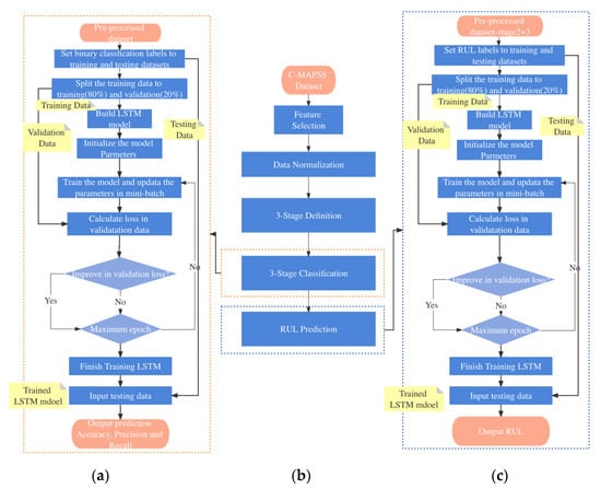 The data in the stage where is neglected in this step. Then and (or ) are used to train the second model. Based on these two models, the testing data can be classified into three stages purely based on the input variables . It should be noted that the original training set is split into two parts: the first 80% of engines for training and the last 20% of engines for validation. The parameters used in the structure include activation function: sigmoid; neuron number: 128; optimiser: Adam; loss function: the binary cross-entropy. It should be noted that the selection of these parameters can impact the accuracy of RUL prediction. The selected parameters in this study are based on a previously detailed investigation of the effect of parametric uncertainty conducted by Wang et al. [28].