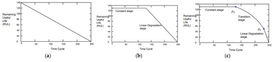 Similar to the piece-wise linear degradation model, this study assumes that the degradation of the system only starts after a certain degree of usage. However, this paper also considers that it will not turn into the linear degradation mode directly after the threshold value. Instead, the degradation speed should be slow and then increase over time. Therefore, we propose a three-stage RUL target function, as illuminated in Figure 4c, which includes the constant stage, the transition stage, where the system degrades nonlinearly with usage, and the linear degradation stage.