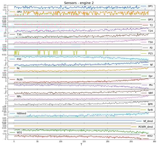 Figure 6 plots the raw sensor measurements of Engine 2 in the dataset FD001, where the variation of each sensor can be observed. Seven sensors (OP3, T2, P2, P15, farB, Nf_dmd, and PCNfR_dmd) have no variation and were discarded in the first step.