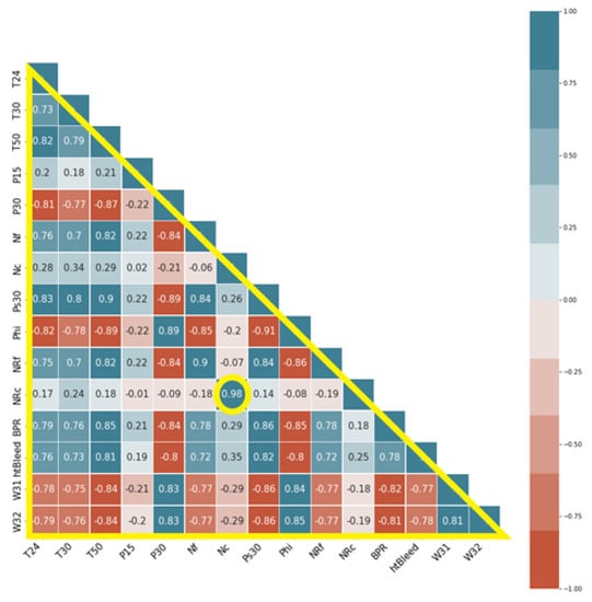 In the third step, the pairwise correlation coefficients among the selected sensors were calculated using Equation (2), and the results are illustrated in Figure 7. A pre-set threshold of 0.95 was used in this case study. It can be observed that Nc and NRc are highly correlated (r = 0.98), which suggests there is no additional benefit to including both measures for the RUL prediction. Therefore, we dropped the sensor Nc for the following analysis in this study. Through these three steps, the 14 sensors of T24, T30, T50, P15, P30, Nf, Ps30, Phi, NRf, NRc, BPR, htBleed, W31 and W32 are finally selected as the features for the multi-stage RUL prediction in the dataset FD001. The selection of the features can be verified by the practical meaning shown in Table 2. For instance, Nf_dmd and PCNfR_dmd refer to the demanded fan speed and the demanded corrected fan speed. They are fixed values and are not supposed to influence the RUL prediction. In addition, Nc and NRc are physical core speed and corrected core speed, which are supposed to have high intercorrelation.