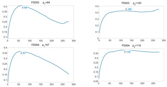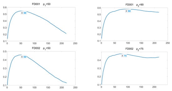 To achieve the 3-stage classification, the two thresholds and need to be determined after the MinMax normalisation. Figure 8 plots the mean correlation value against different for the four datasets using Equation (6) (the left column of Figure 8) and Equation (8) (the right column of Figure 8). The values of the peaks are selected as and . It is observed that can be easily set with a clear peak, which suggests that the linear degradation stage (the third stage) is relatively easy to be distinguished. The value of is between 50 to 65 for these datasets. The selection of is tricky as the mean correlation value doesn’t drop dramatically with large values indicating that the boundary between the transition stage (the second stage) and the constant stage (the first stage) is usually vague. The selection of in datasets FD001 and FD002 are relatively smaller than those in FD003 and FD004, suggesting that the engines with more fault conditions may enter stage 2 sooner.